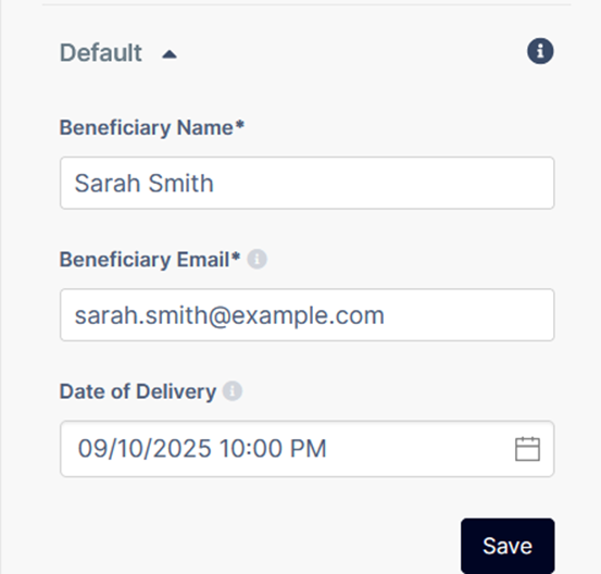 Entering the details of who it’s for, and what date you’d like it sent (the date is important, don’t worry about a specific time)